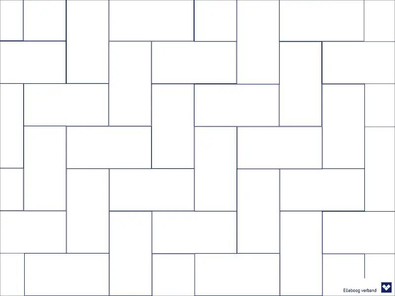 - Het dubbel elleboog verband ontstaat door twee tegels in een hoek van 90 graden ten opzichte van de muren (recht/haaks) te leggen. De tegels vormen "elleboogjes"