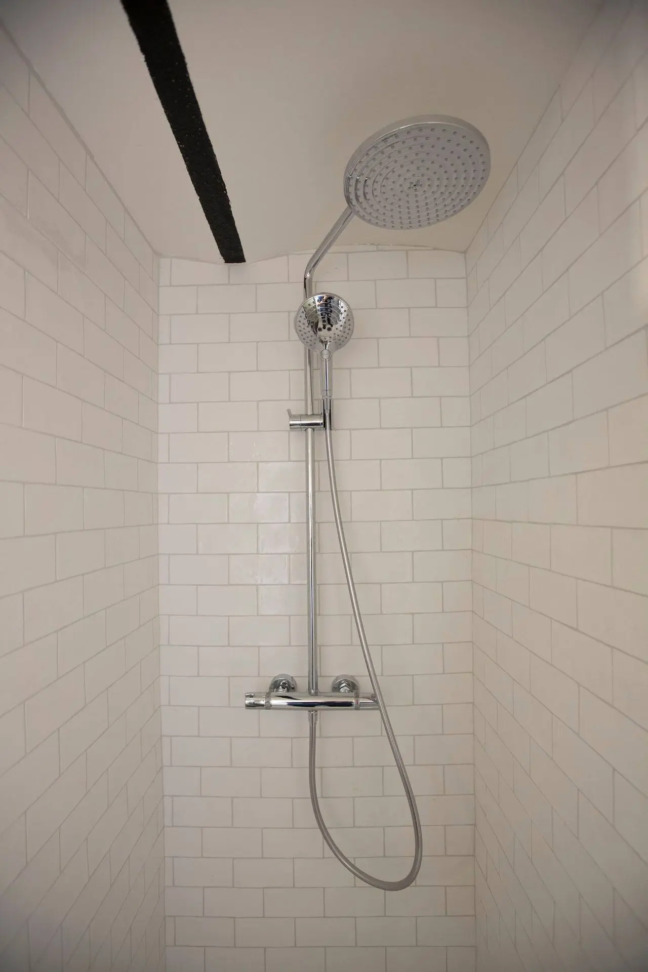 Witte, matte wandtegeltjes geven deze badkamer een zachte, neutrale basis. Door hun subtiele imperfectie blijft het geheel speels en warm. In combinatie met de blauwe patroontegels ontstaat een fris contrast dat meteen karakter geeft.