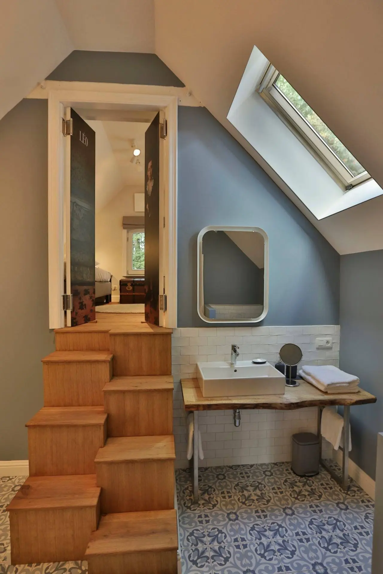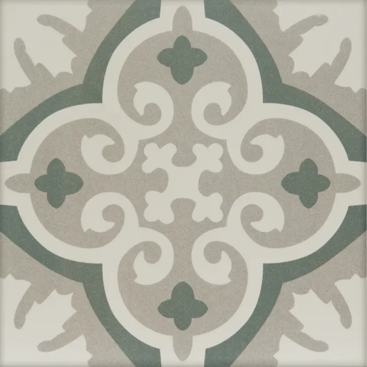 De vloer in patroontegels Madeleine Ancelina in groen- en grijstinten zet de typische charme van Atelier Antonine extra in de verf. Een combinatie die toont hoe kleuren en texturen elkaar kunnen versterken.