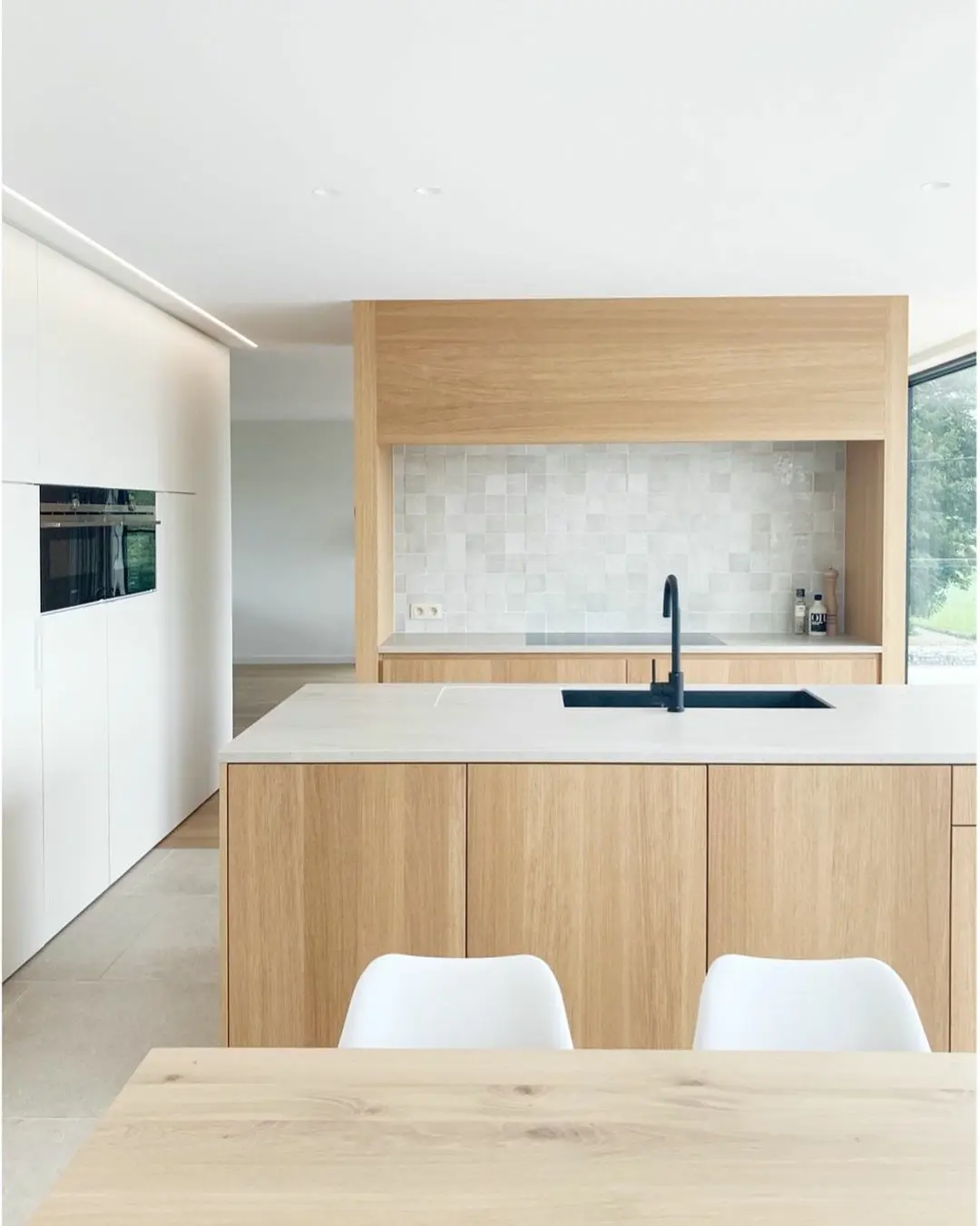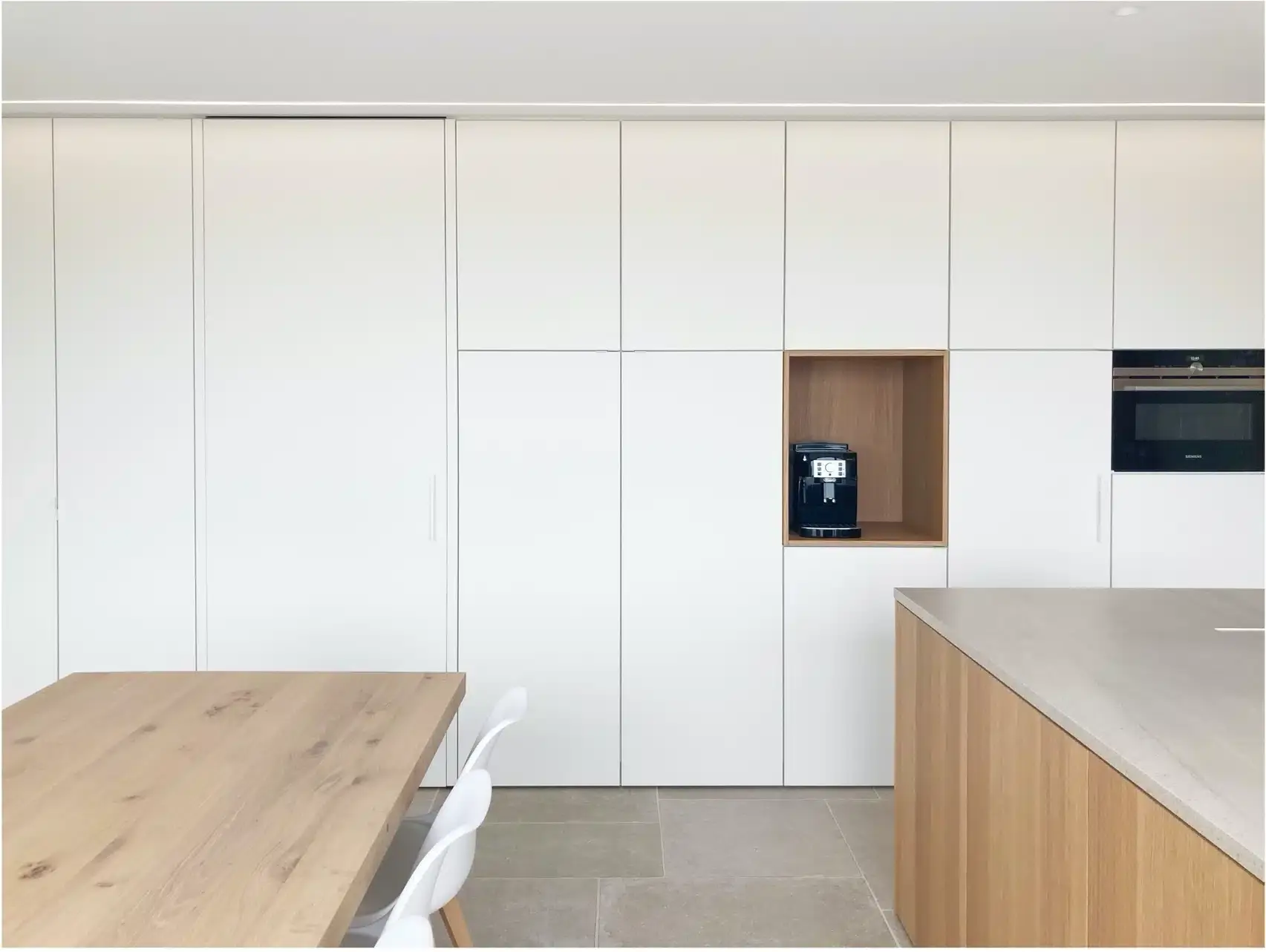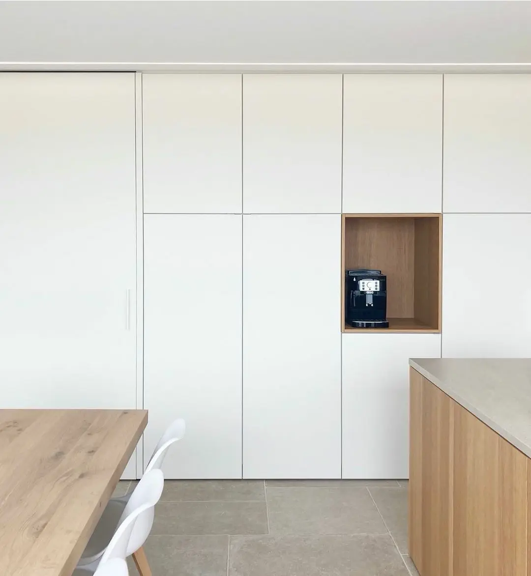 In deze keuken werd de Robust ivory in Romeins patroon geplaatst. De rustieke beige-grijze tinten in een natuursteenlook geven de ruimte karakter zonder te overheersen. De uitstraling is doorleefd en authentiek en combineert perfect met de strakke afwerking van de keukenkasten en meubels.