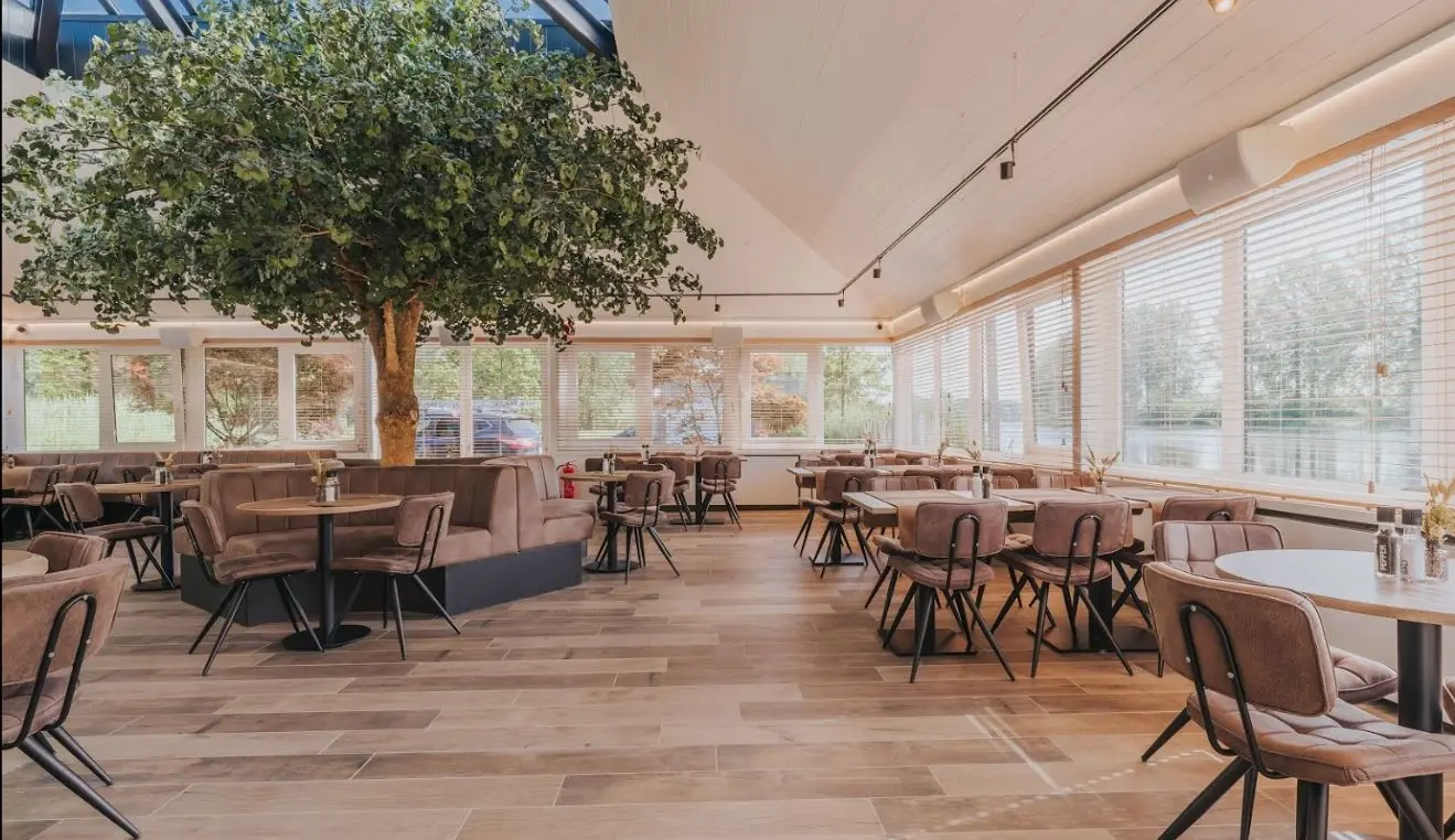 Dit restaurant in Bornem met prachtig uitzicht over de Oude Schelde koos voor een warme houtlook vloertegel Jungle grey doorheen de zaal.