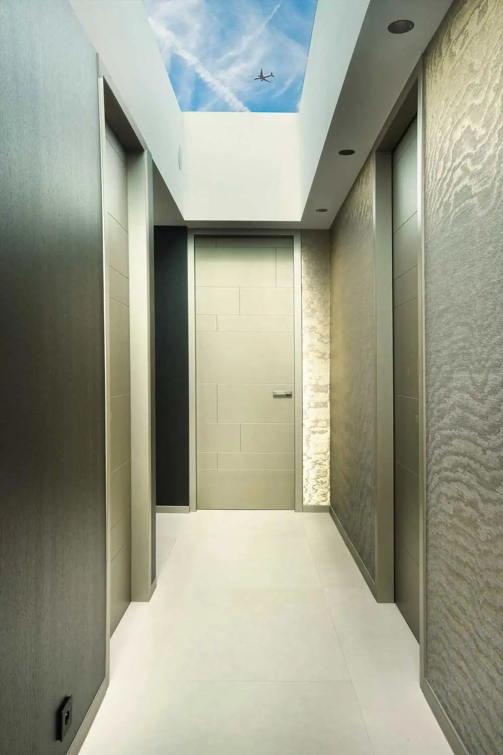 De deuren van de inkomhal doen denken aan deuren in hotelkamers. Daarbij keert het motief als vast patroon terug zoals in de buitengevel. De bouwheer liet hiervoor bij ons deze Grote XXL tegelplaten in verschillende formaten verzagen. Dit patroon met XXL tegels werd ook toegepast in de muurbekleding van het kantoor en in de vloertegels doorheen de villa.