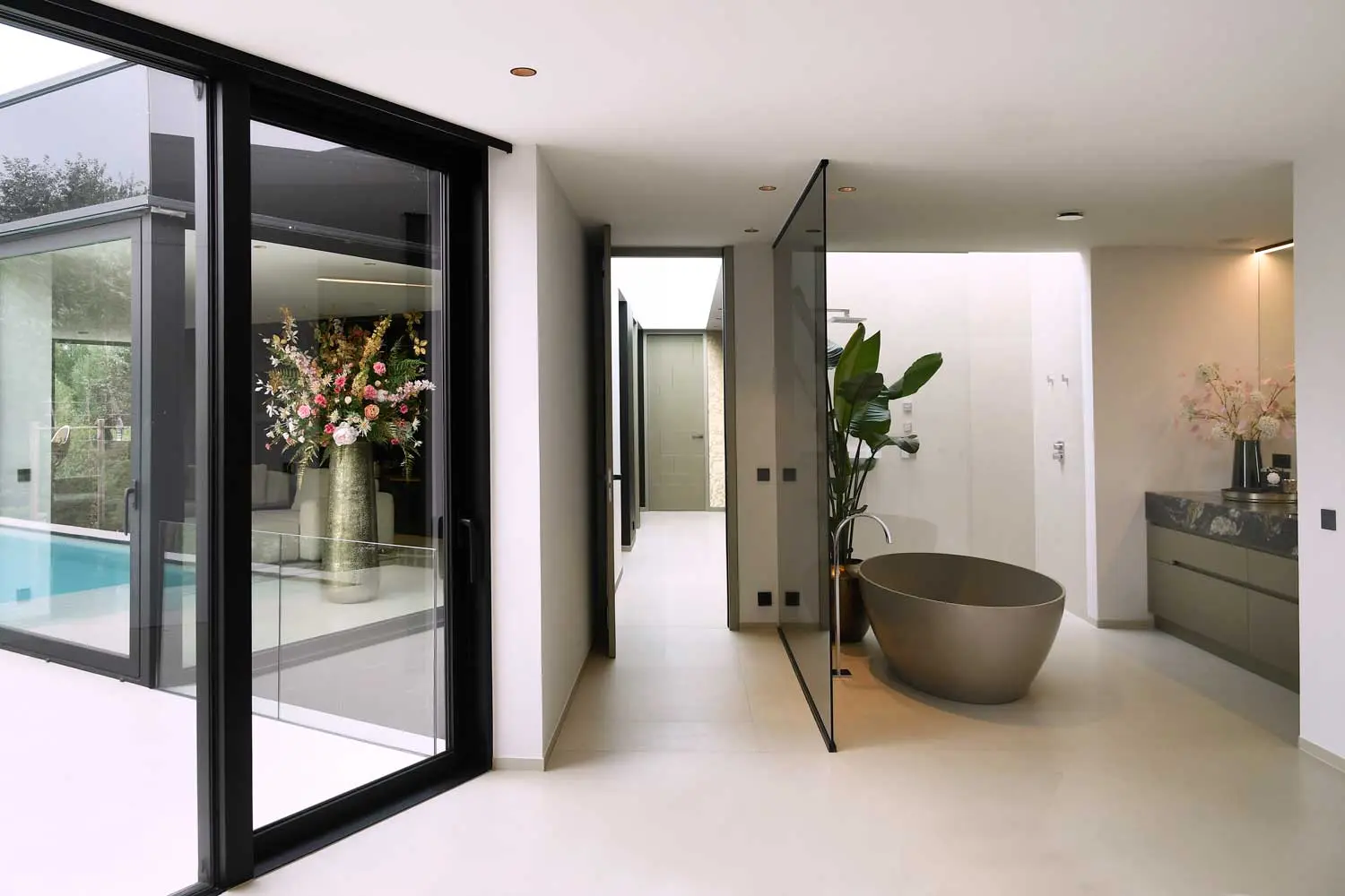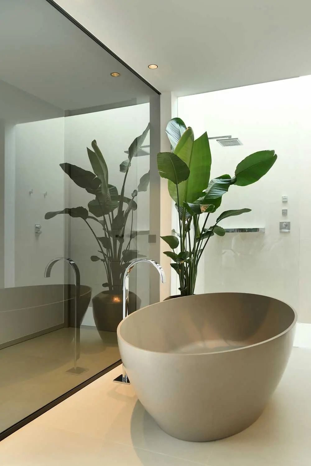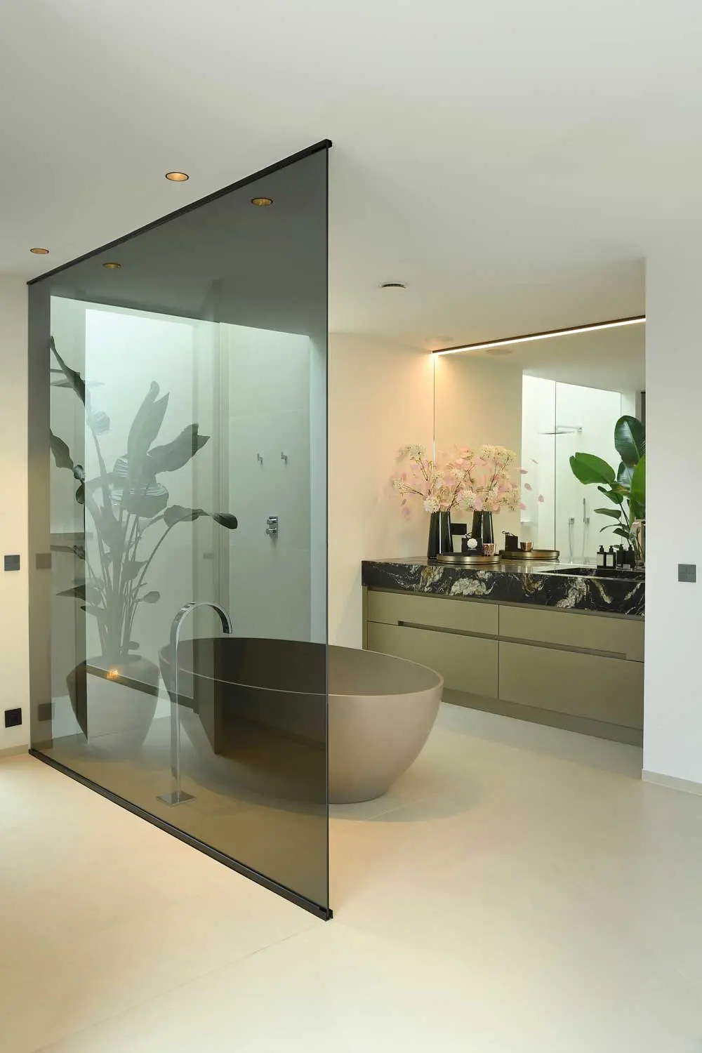 De badkamer is voorzien van een kwartsieten lavabo en design regendouche. Het is een open badkamer met een zwarte glazen wand en een vrijstaand bad in solid surface dat aanvoelt als een mini-spa met een maxi wellness gehalte. Ook hier is er gekozen voor hetzelfde materiaal als de voorgevel, de XXL tegel.
