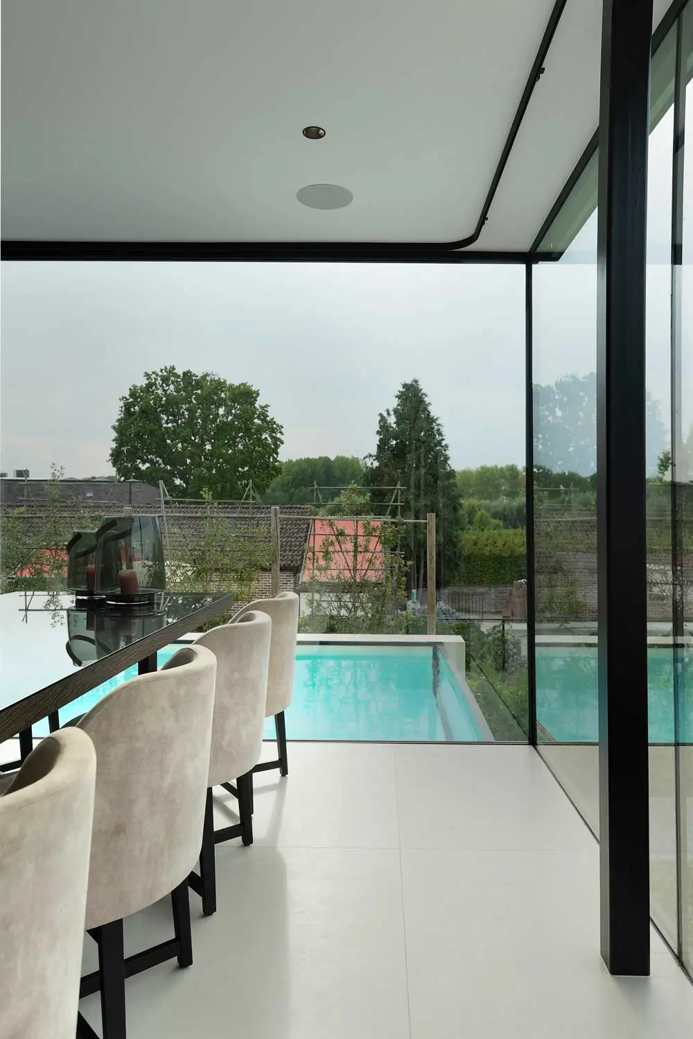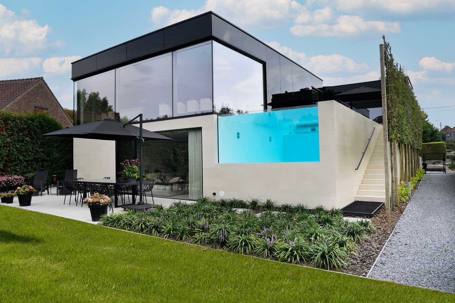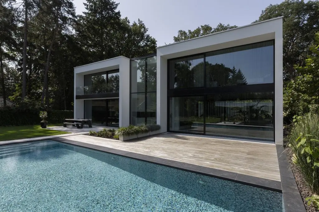 Het zwembad op de eerste verdieping heeft zicht op de tuin via een glazen plaat. Dit detail geeft een extra vakantiegevoel. De prachtige steeneiken bomen maken het plaatje af. Vervolgens neemt een buitentrap u mee naar beneden. Om uniformiteit met de voorgevel te bereiken werd de achtergevel inclusief afwerking van het zwembad en trap met hetzelfde materiaal bekleed, namelijk de XXL tegel.