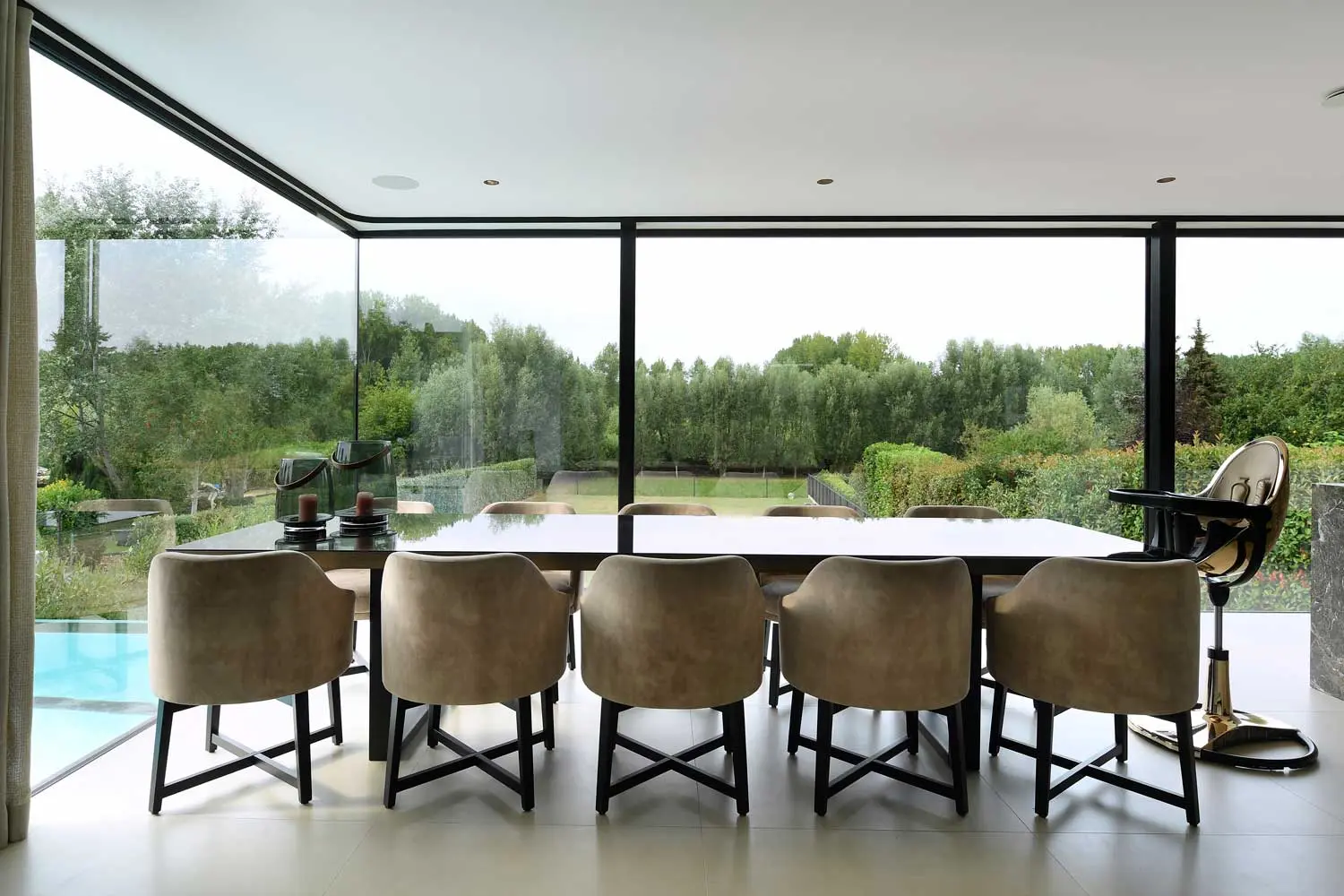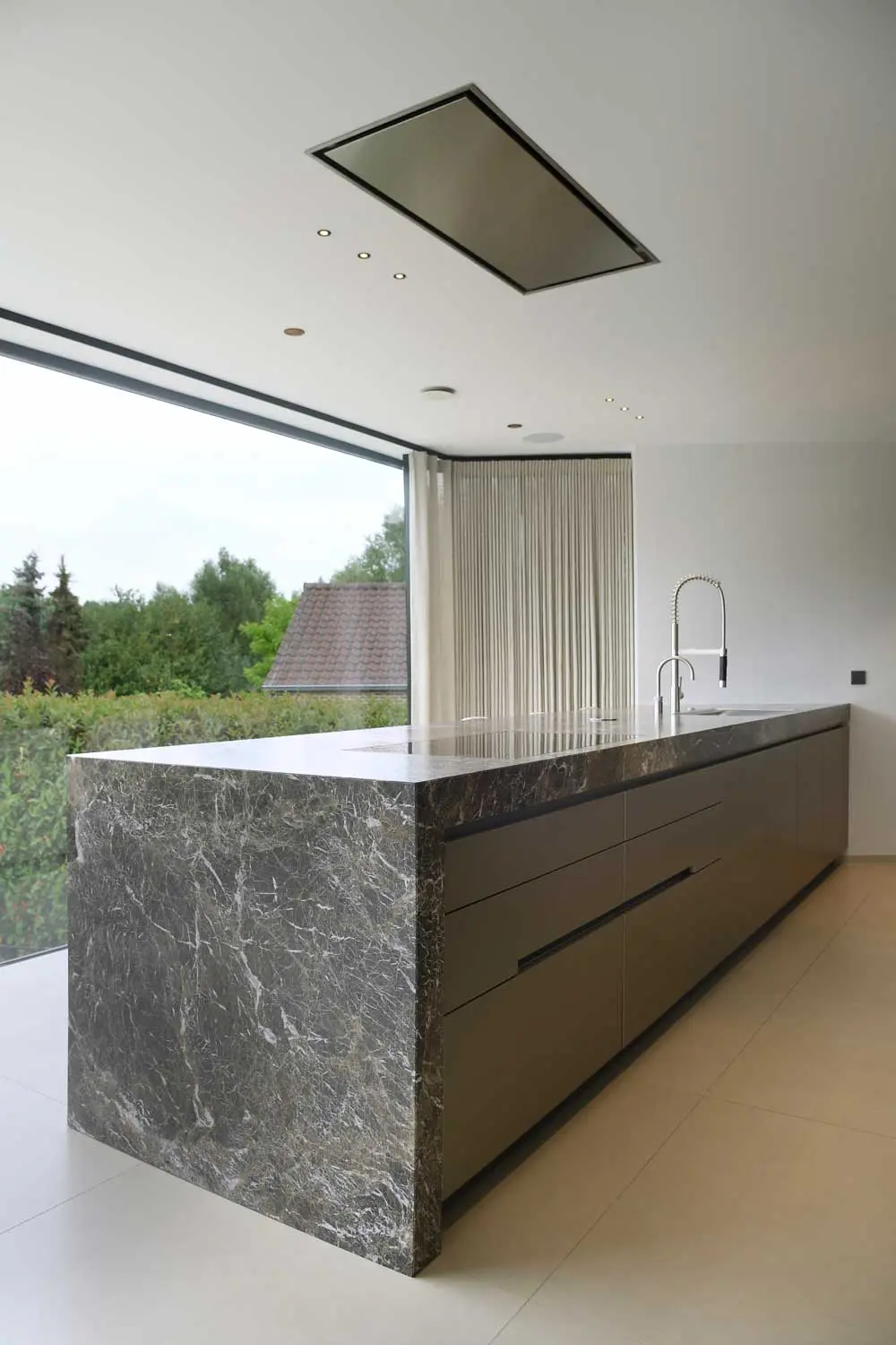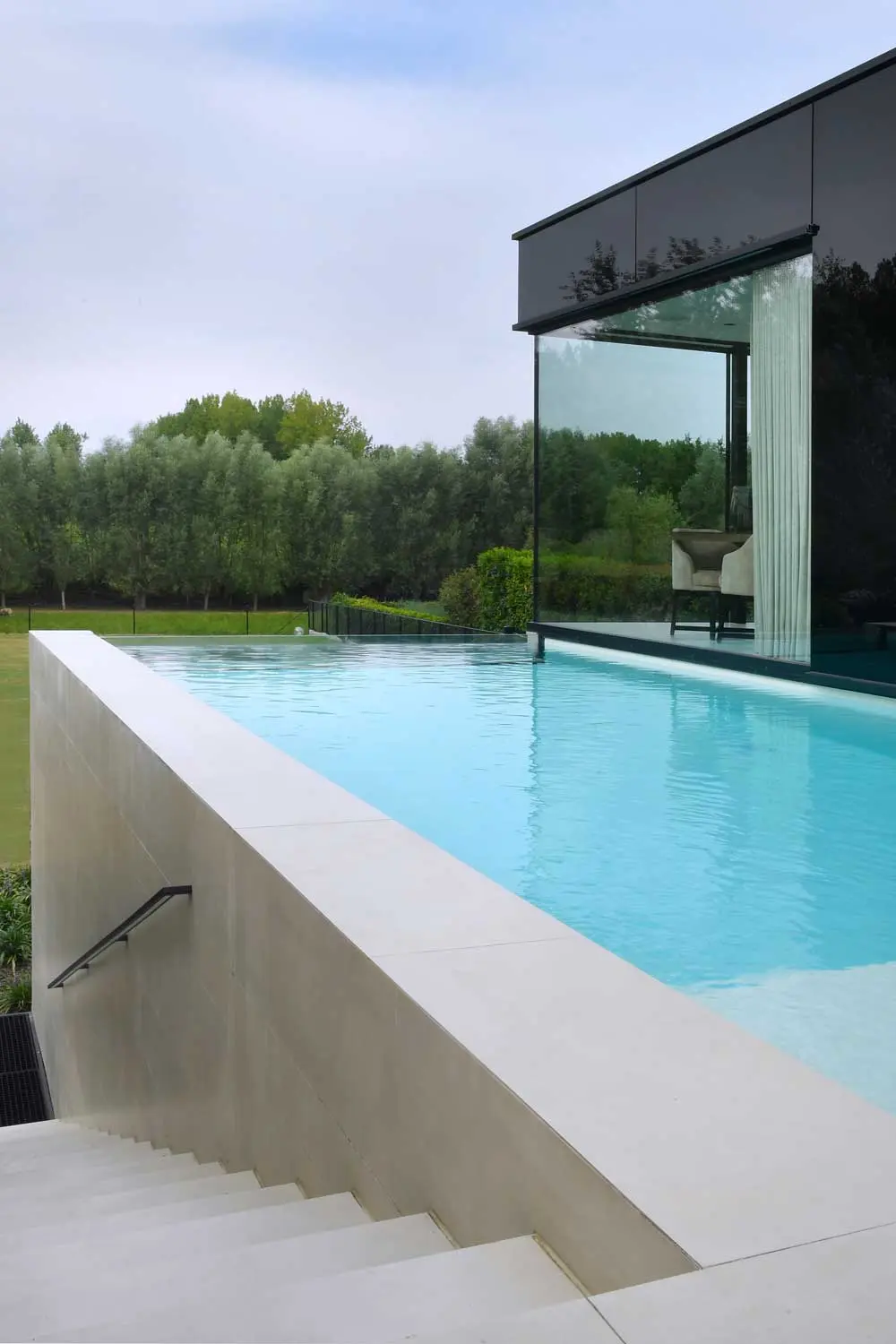Het zwembad op de eerste verdieping heeft zicht op de tuin via een glazen plaat. Dit detail geeft een extra vakantiegevoel. De prachtige steeneiken bomen maken het plaatje af. Vervolgens neemt een buitentrap u mee naar beneden. Om uniformiteit met de voorgevel te bereiken werd de achtergevel inclusief afwerking van het zwembad en trap met hetzelfde materiaal bekleed, namelijk de XXL tegel.