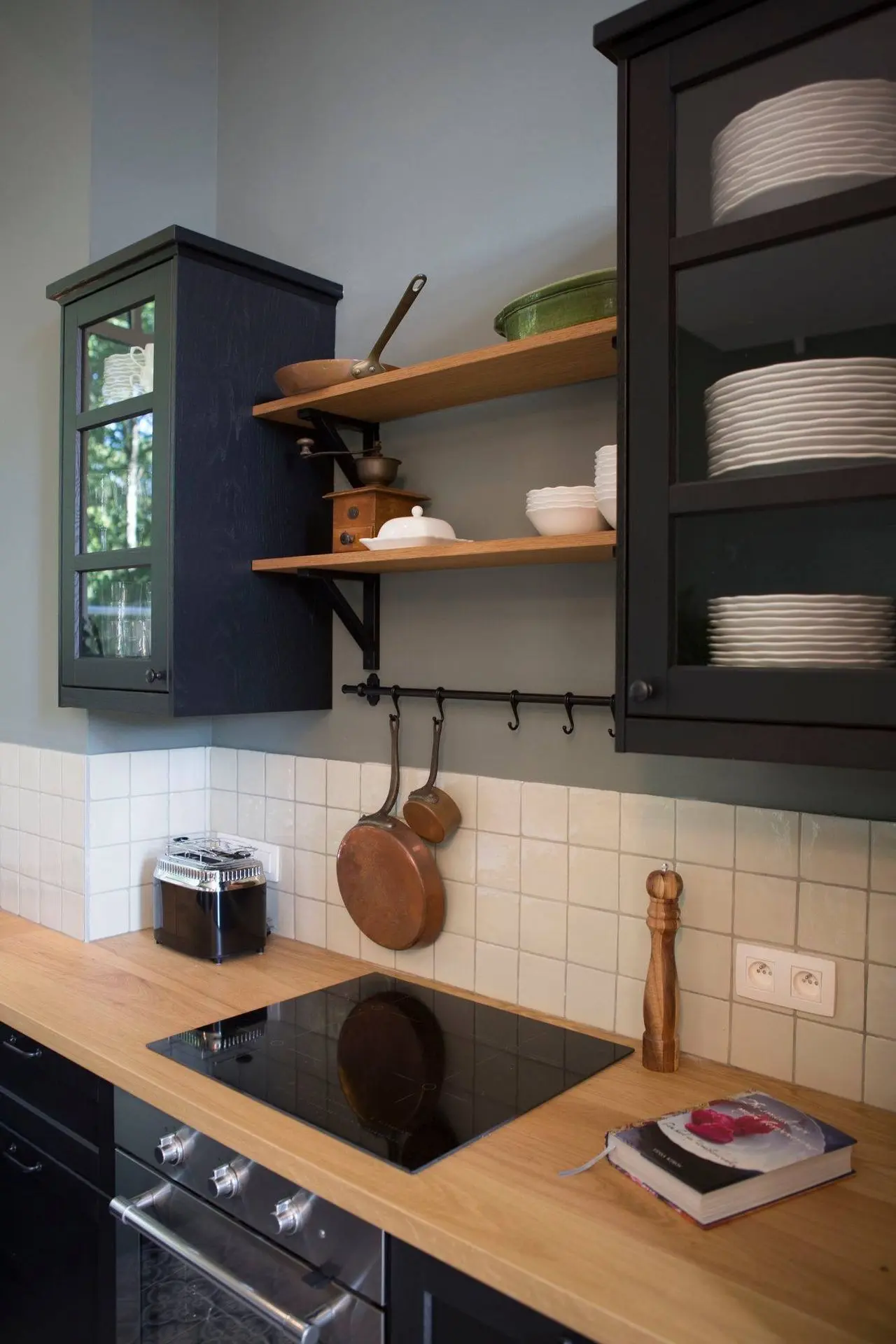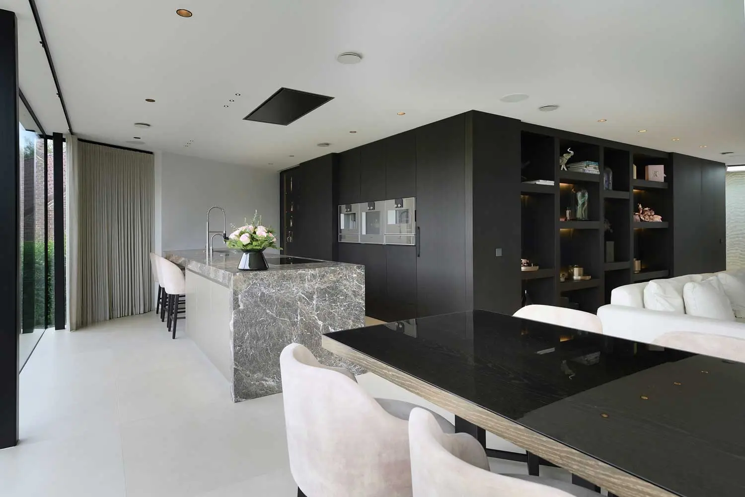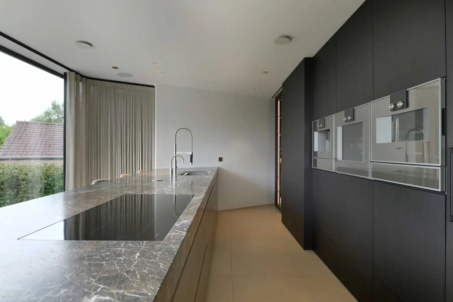 Een glazen achterwand in de keuken en eetruimte biedt uitzicht op de tuin, schaapjes inclusief. Om het hotelgevoel te versterken, is er een stijlvolle bar discreet verborgen in de keuken. Een lekker wijntje uit de wijnkoeler? Het is allemaal voorzien.