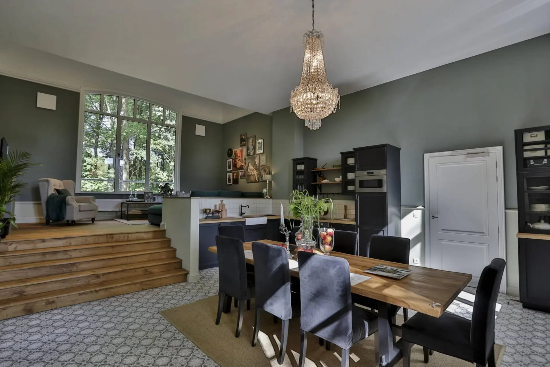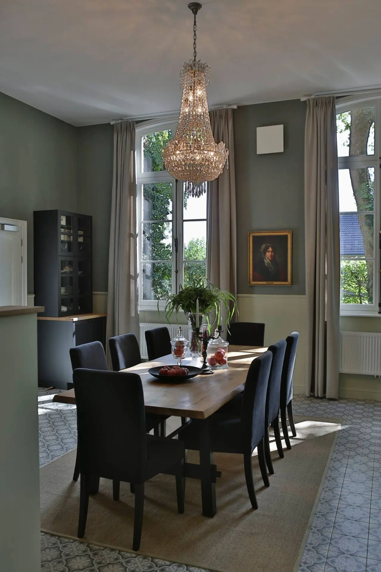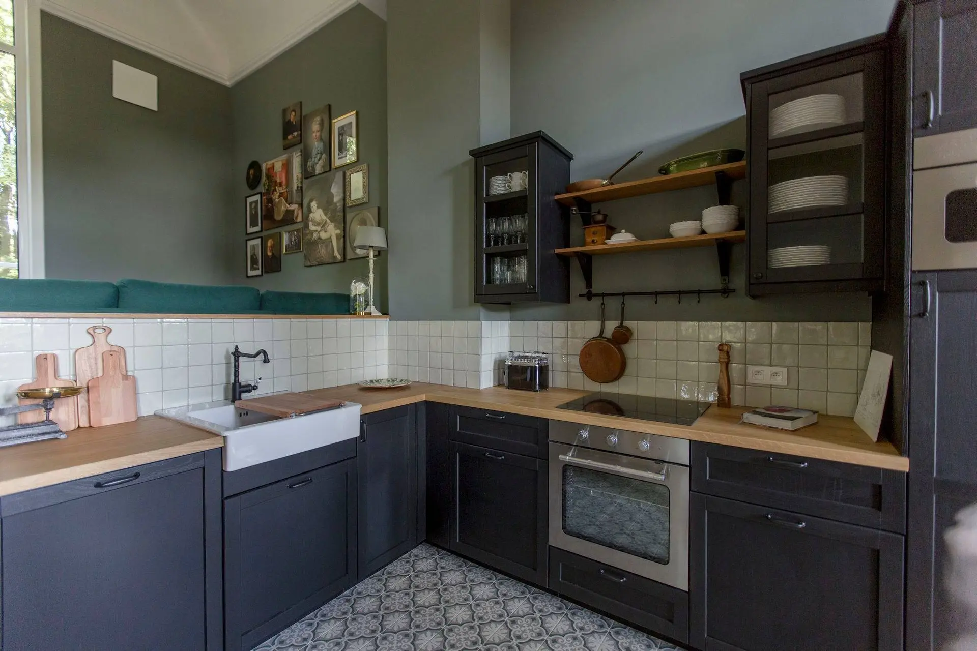 De vloer in patroontegels Madeleine Ancelina in groen- en grijstinten zet de typische charme van Atelier Antonine extra in de verf. Een combinatie die toont hoe kleuren en texturen elkaar kunnen versterken.