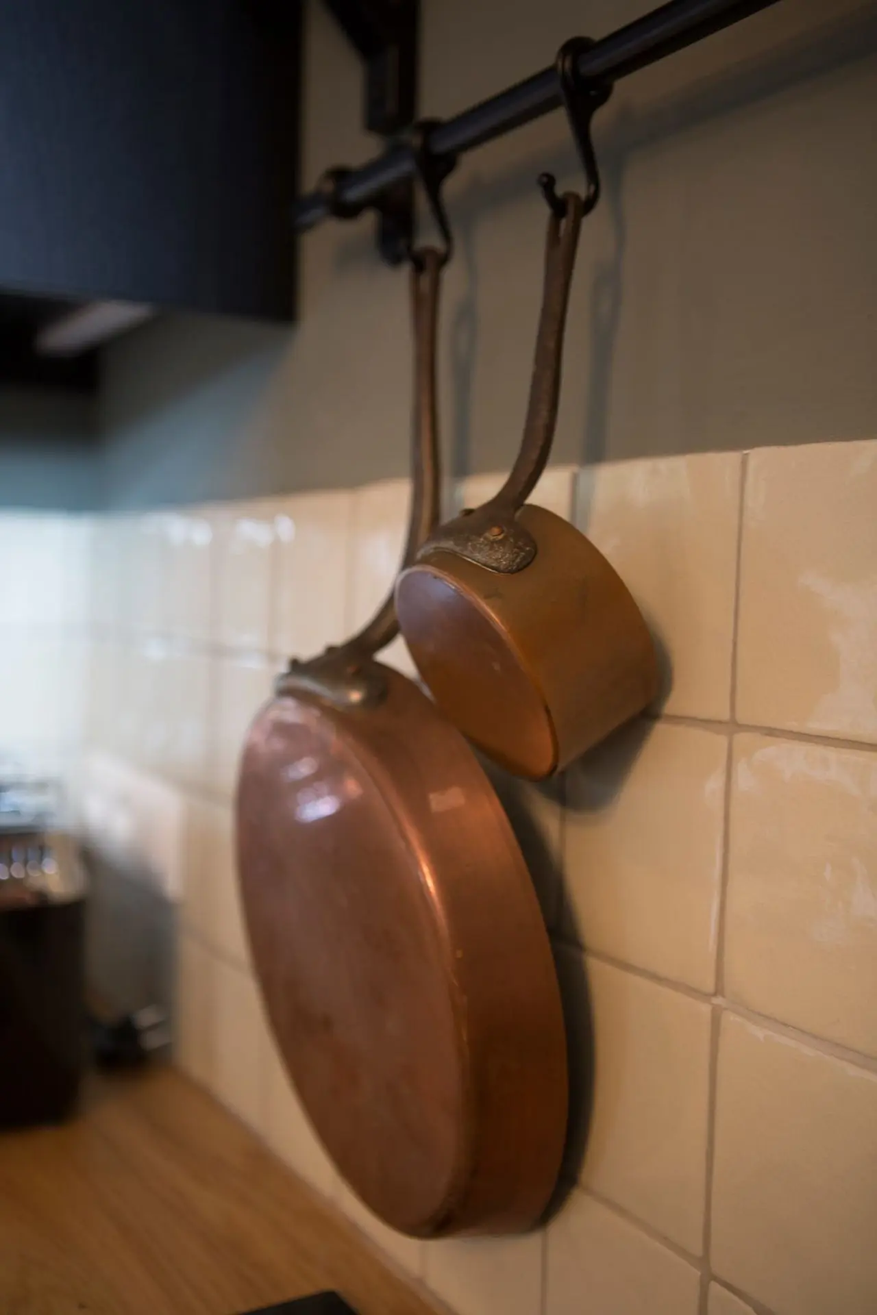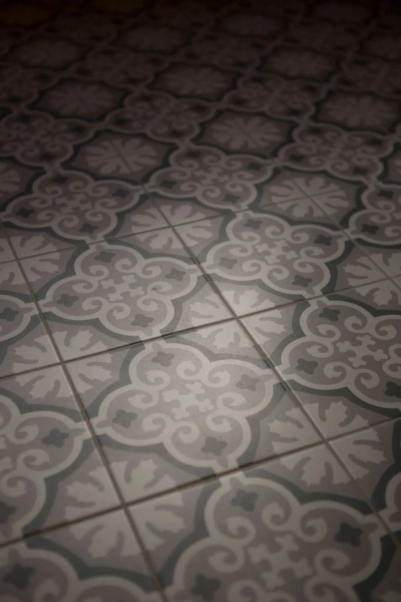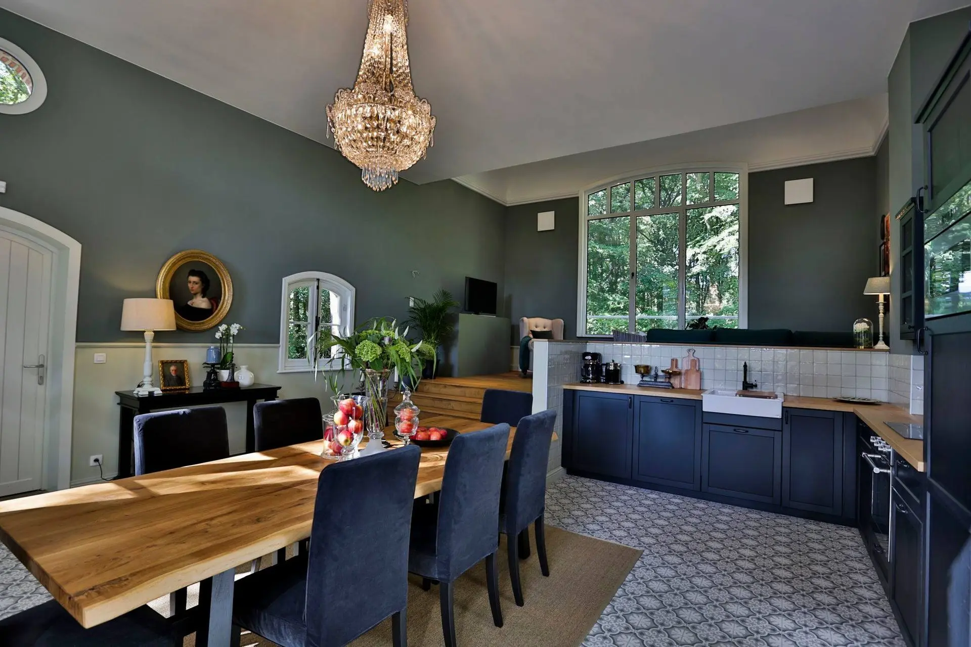 De vloer in patroontegels Madeleine Ancelina in groen- en grijstinten zet de typische charme van Atelier Antonine extra in de verf. Een combinatie die toont hoe kleuren en texturen elkaar kunnen versterken.