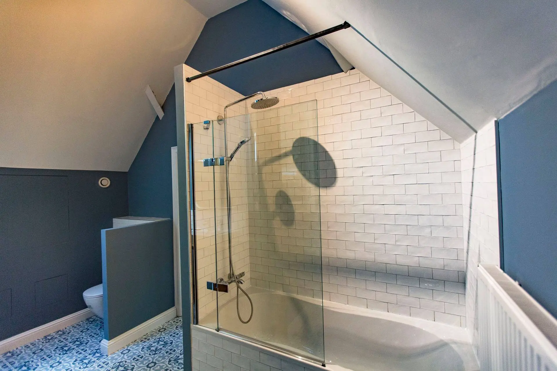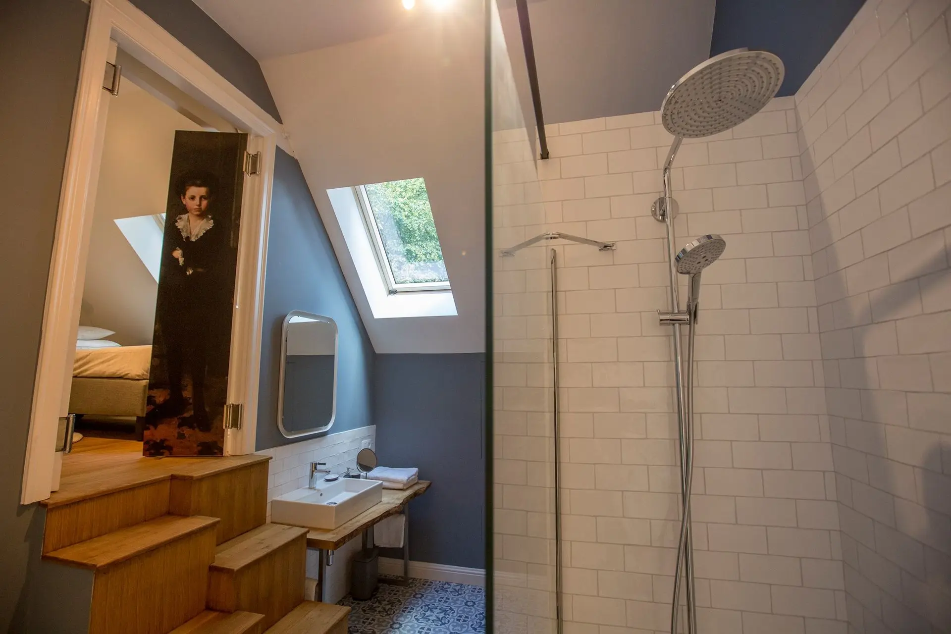 Witte, matte wandtegeltjes geven deze badkamer een zachte, neutrale basis. Door hun subtiele imperfectie blijft het geheel speels en warm. In combinatie met de blauwe patroontegels ontstaat een fris contrast dat meteen karakter geeft.