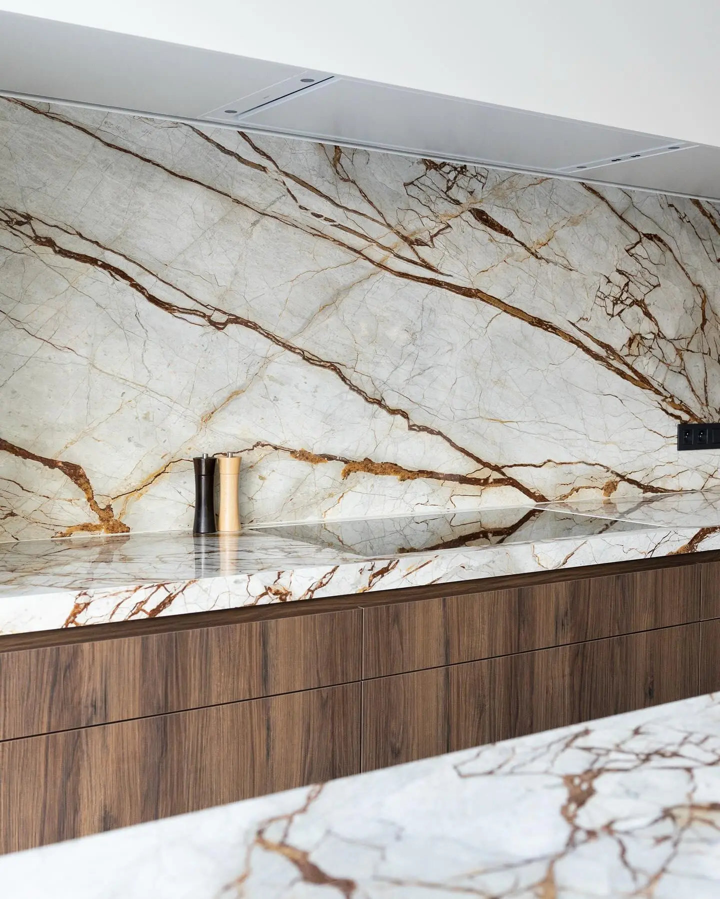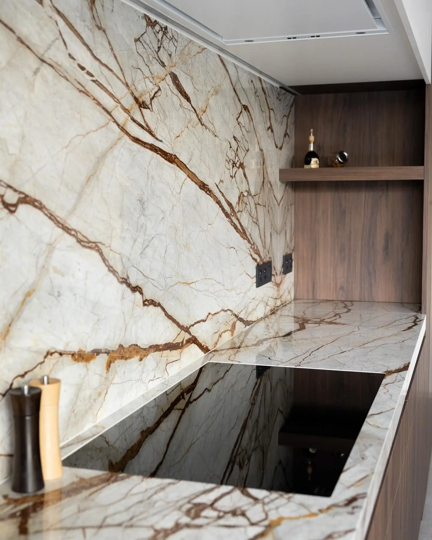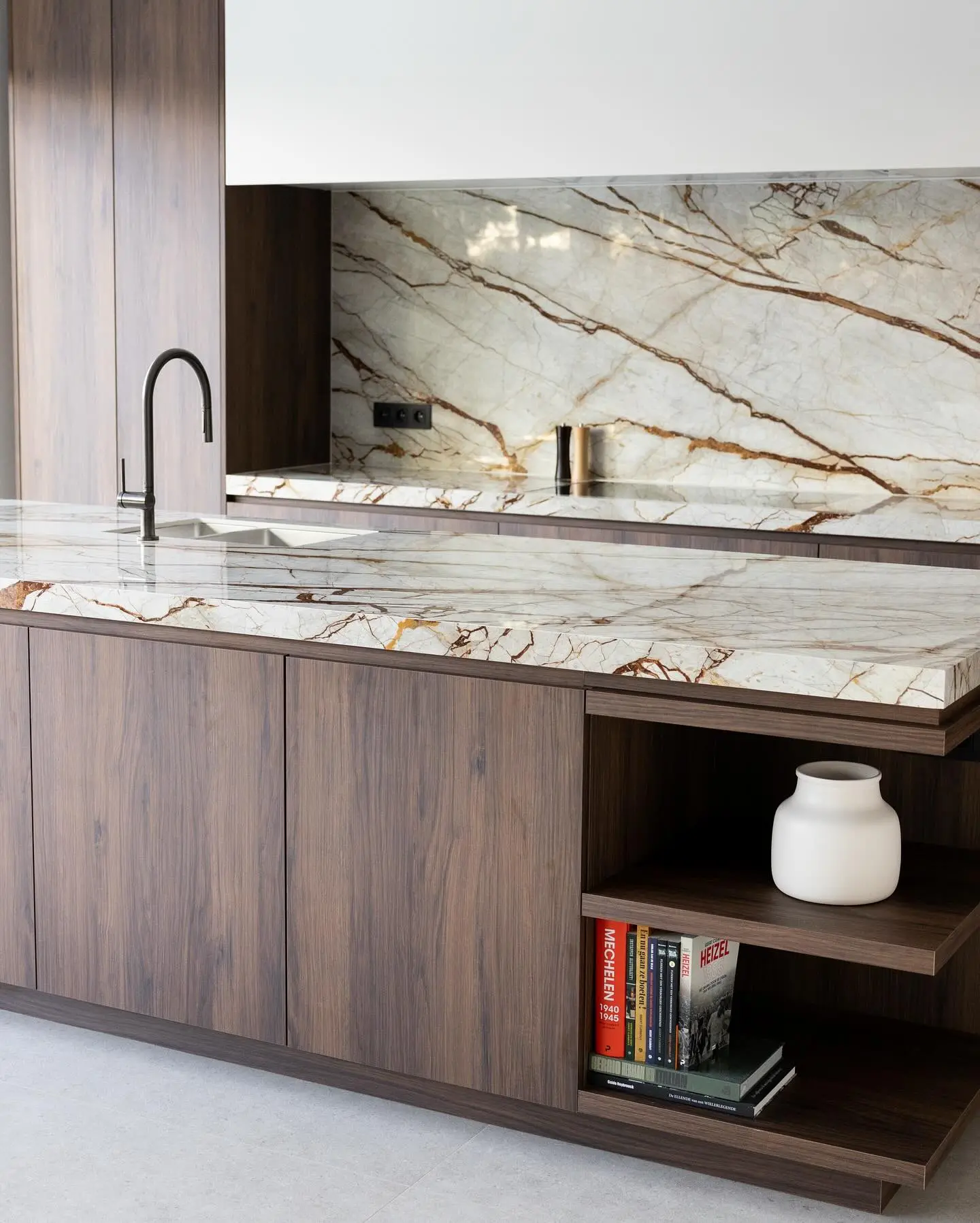 Een keuken krijgt pas karakter wanneer je kiest voor materialen die de tand des tijds doorstaan. Dit keukenaanrecht in marmerlook, afgewerkt met XXL-tegelplaten met warme bruinrode nerven, is daar het perfecte voorbeeld van. Het oogt luxueus, strak en maakt meteen een opvallend statement in je interieur.