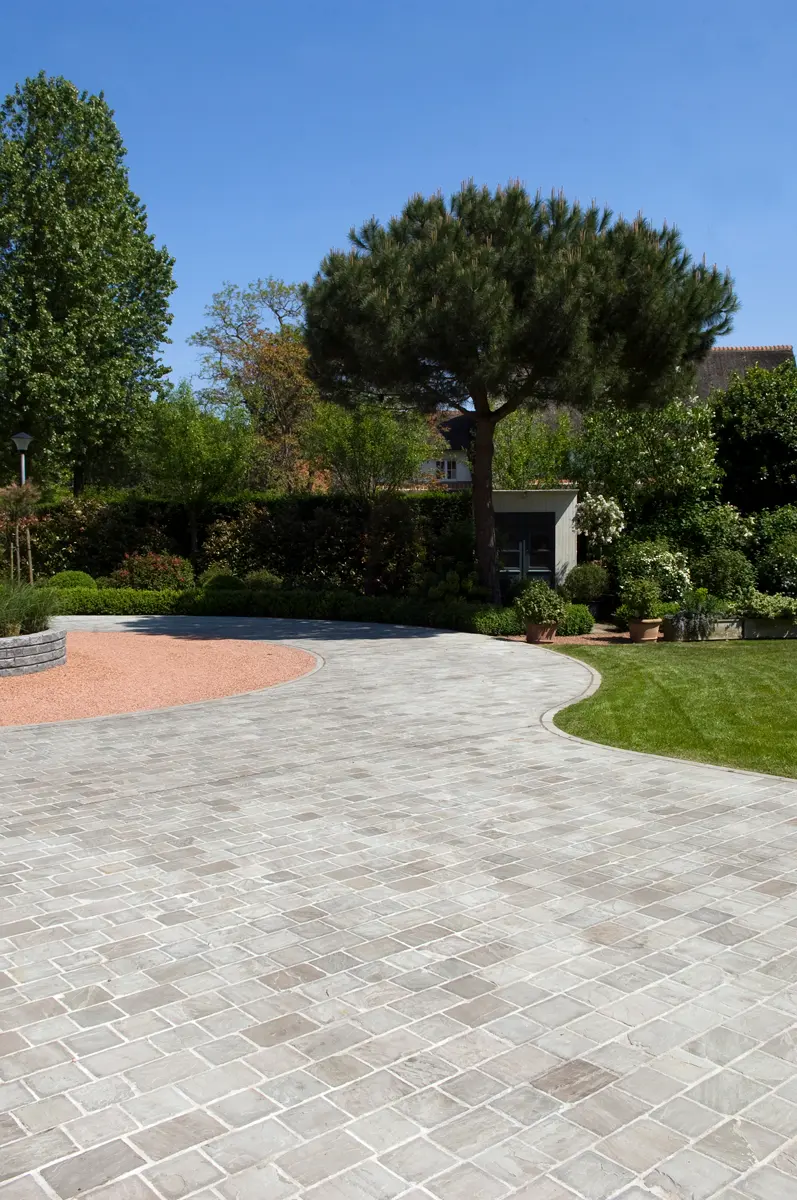 Tegels op een oprit kies je best niet te groot. Strakke tegels van 1,20 x 1,20 m op de oprit kan, maar ze vragen wel een zeer goede en stabiele plaatsing.