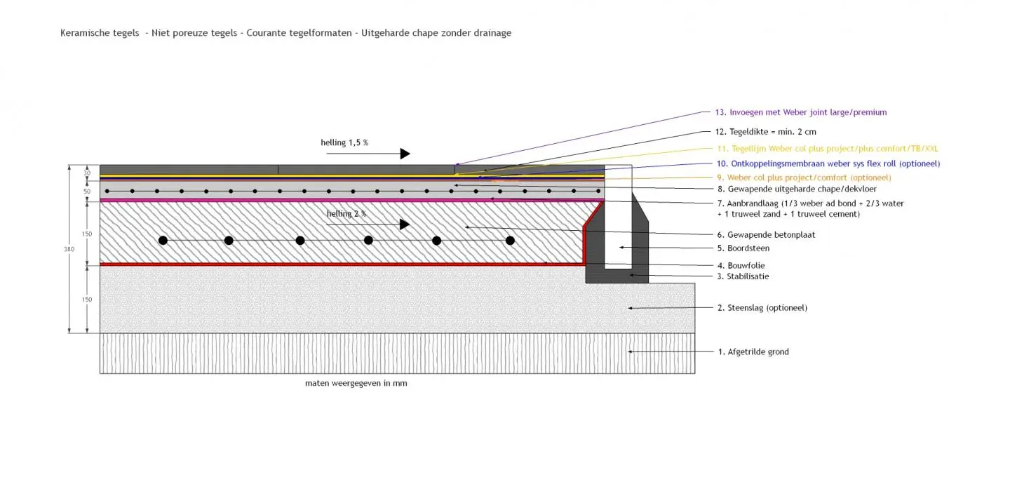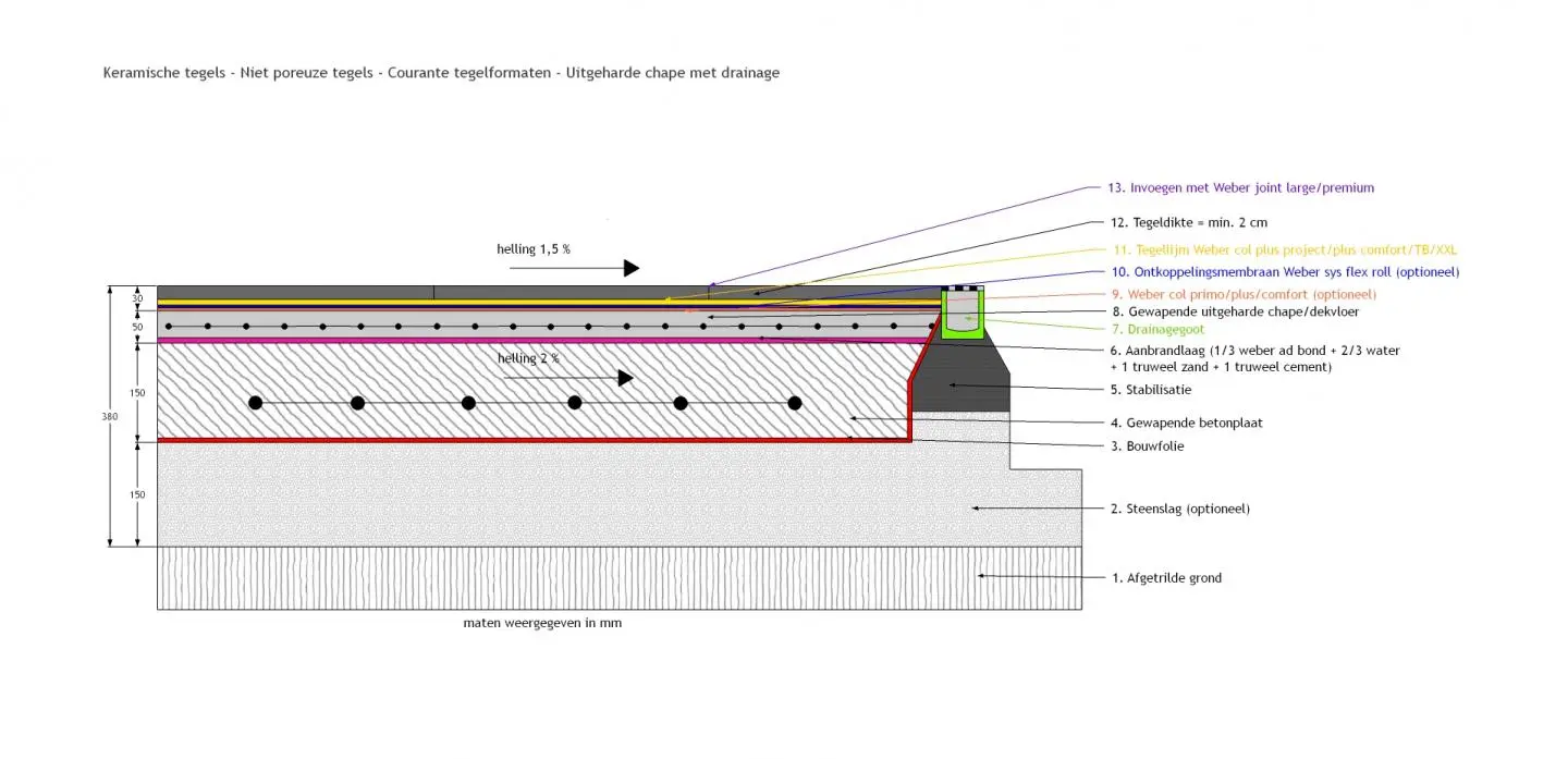Hieronder de ideale opbouw voor het plaatsen van keramische tegels met courante tegelformaten en op basis van een uitgeharde chape.