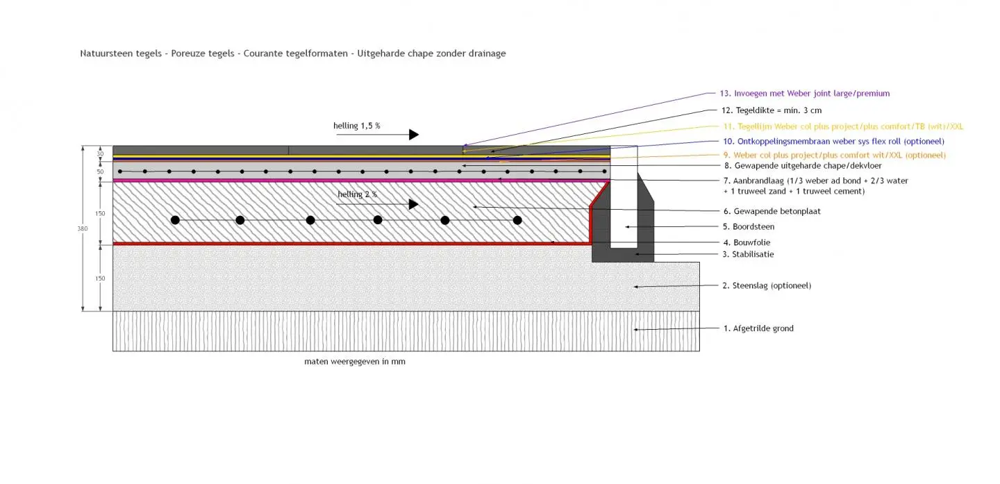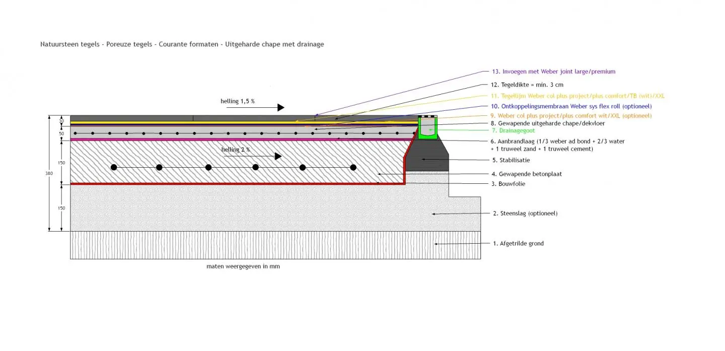 Hieronder de ideale opbouw voor het plaatsen van natuursteen, buiten, poreuze tegels, courante tegelformaten op een uitgeharde chape.