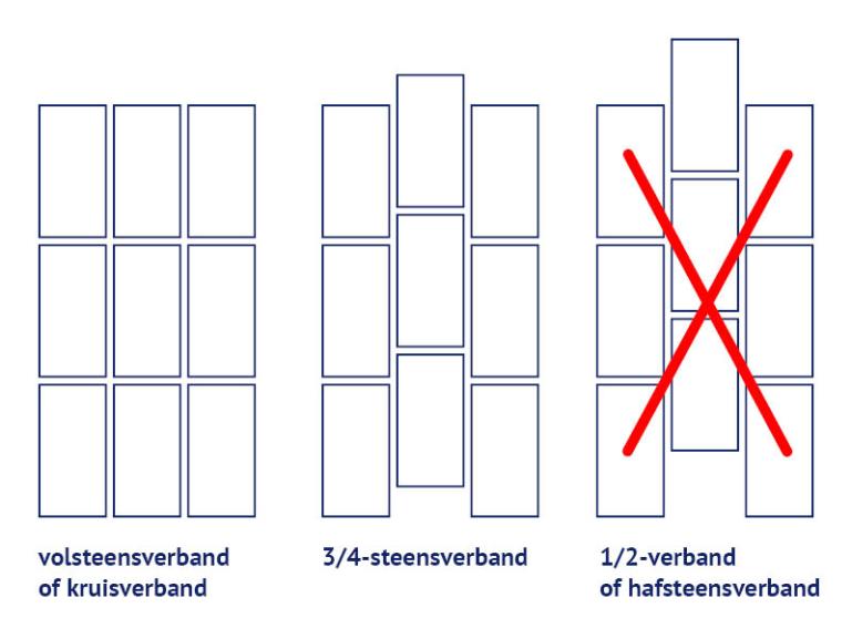 - 1/2-steensverband moet vermeden worden.