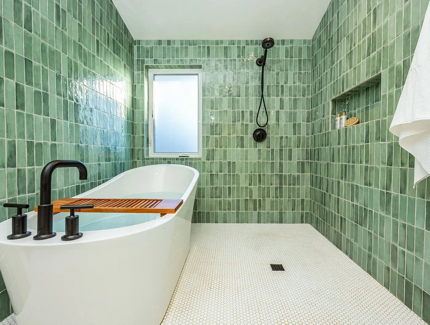 De badkamerwand in kleine, smalle Tbrick Eucalyptus tegeltjes trekt meteen de aandacht met zijn frisse, natuurlijke groentint. In combinatie met de open douche en het subtiele klokputje ontstaat een opvallende en originele badkamer.