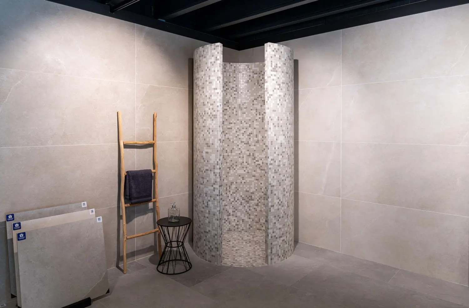 In deze moderne badkamer ligt het accent volledig op de ronde inloopdouche. De ronde betegelde inloopdouche is een combinatie van functionaliteit en design die een gevoel van luxe en verfijning toevoegt aan de badkamer.