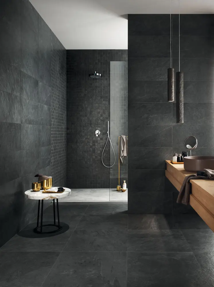 Fan van de authenticiteit en uitstraling van natuursteen maar geen zin in het dagelijks onderhoud dat deze tegel nodig heeft? Kies voor een keramische tegel met een natuursteen look. Deze klassevolle badkamer met inloopdouche lijkt wel volledig opgebouwd uit leisteen, maar niets is minder waar. Het zijn leisteenlook tegels van de Cascade collectie.