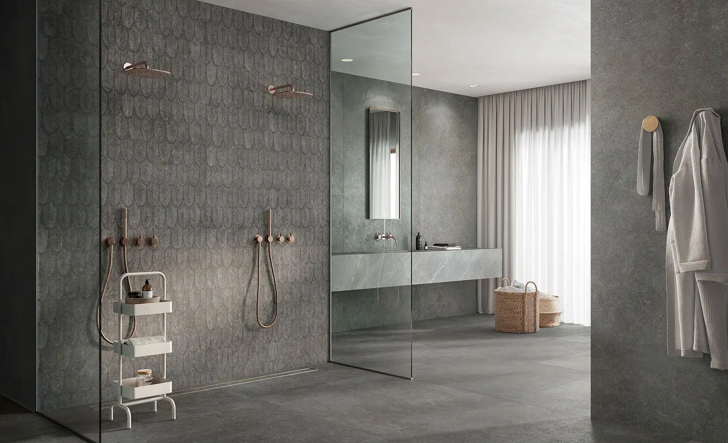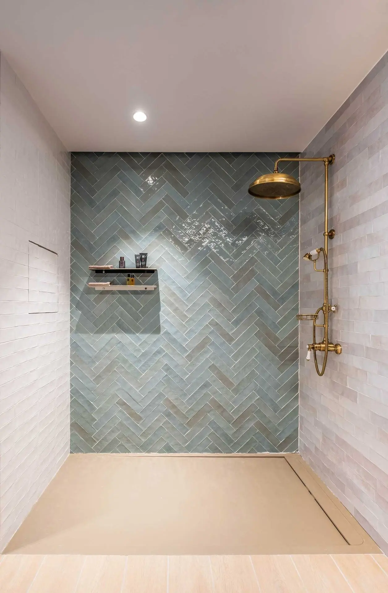 Geen saaie douchebeurten meer in deze originele badkamer, betegeld met een keramische ceppi di gre tegel. Plaats een strakke inbouw Carrodrain douchegoot en u hebt een op en top design badkamer.